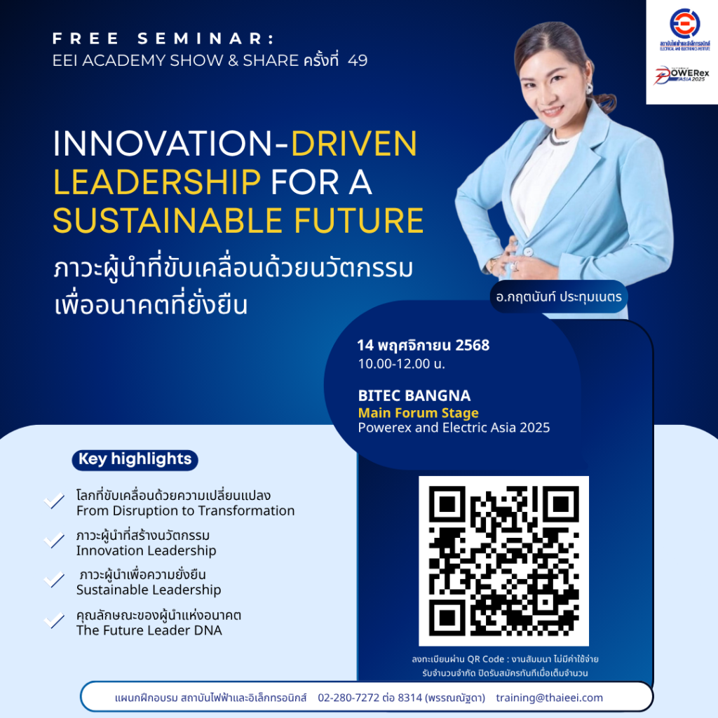 กิจกรรม EEI Academy Show and Share เป็นกิจกรรมที่สถาบันไฟฟ้าฯ มีความตั้งใจมอบองค์ความรู้ที่เป็นประโยชน์ ต้นแบบการพัฒนาที่ดี (Best Practice) หรือ แนวปฏิบัติ และกฏระเบียบใหม่ ๆ ที่เท่าทันต่อสถานการณ์ในปัจจุบันรวมถึงในอนาคต ให้แก่บุคลากรและผู้ประกอบการในภาคอุตสาหกรรมรวมถึงบุคคลทั่วไปที่สนใจ ผ่านการจัดสัมมนาโดยไม่มีค่าใช้จ่าย โดยผู้เข้าร่วมสัมมนาสามารถนำองค์ความรู้ไปต่อยอดเพื่อรองรับสถานการณ์ได้อย่างทันท่วงที
